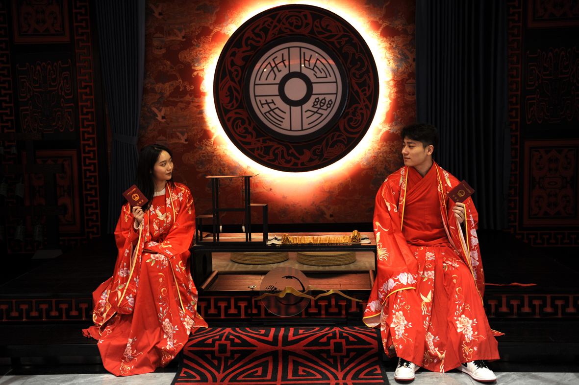 2月14日,陕西西安,新人领证后合影留念。当日,西安市未央区民政局婚姻登记处迎来众多新人办理婚姻登记手续,并在“汉文化”沉浸式婚姻颁证大厅内留影。图片来源:澳洲网