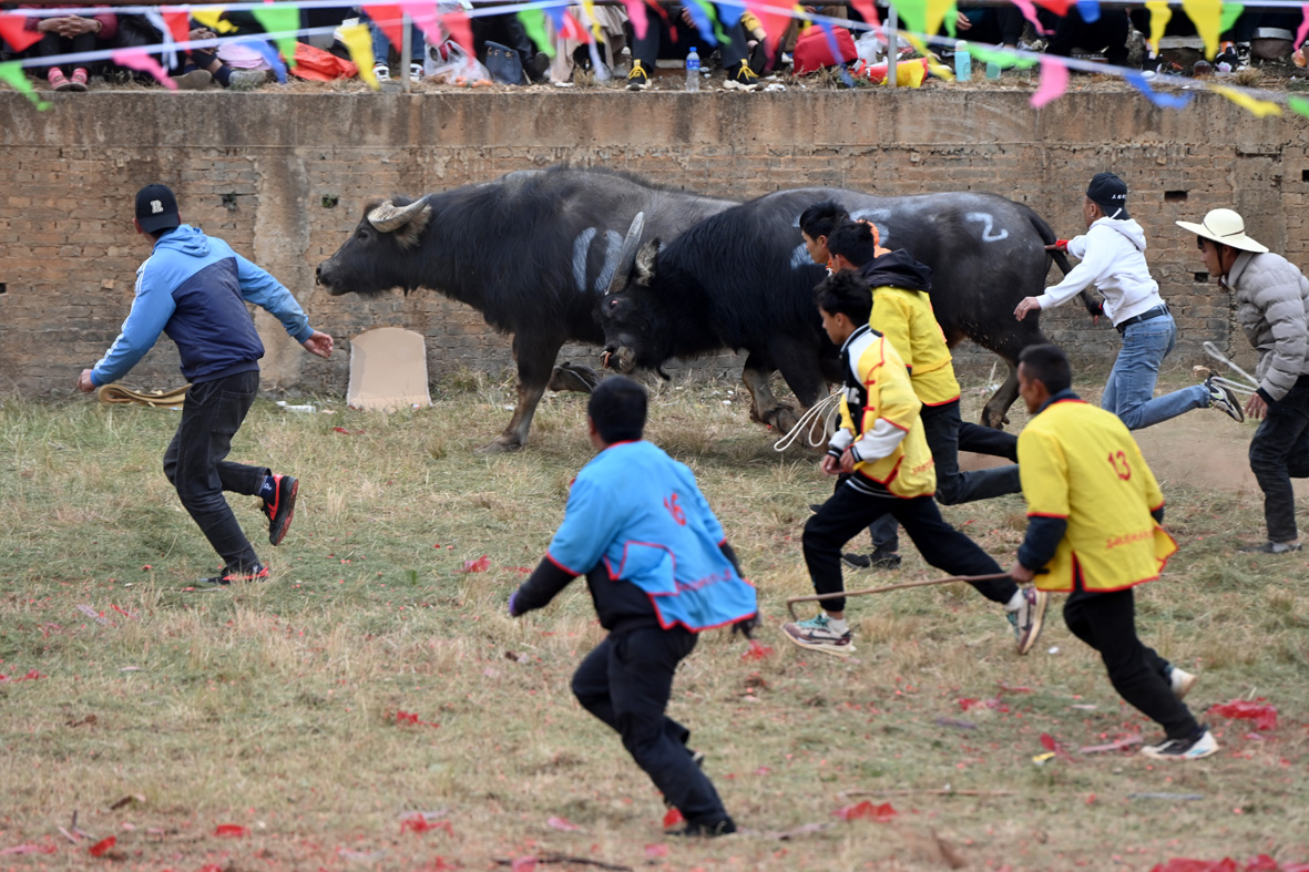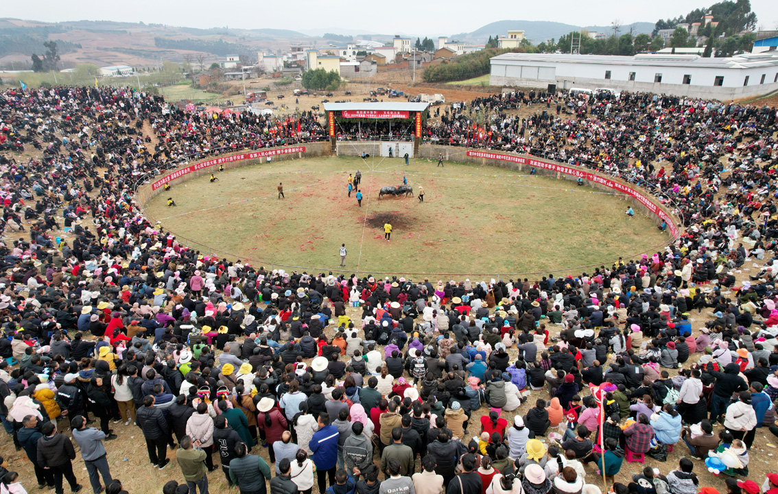 2月19日,斗牛现场吸引民众围观。当日,云南省昆明市宜良县九乡彝族回族乡上演“猎神节”斗牛比赛。“猎神节”是当地彝族群众祈祷五谷丰登、幸福安康的传统节日。(无人机照片)图片来源:澳洲网