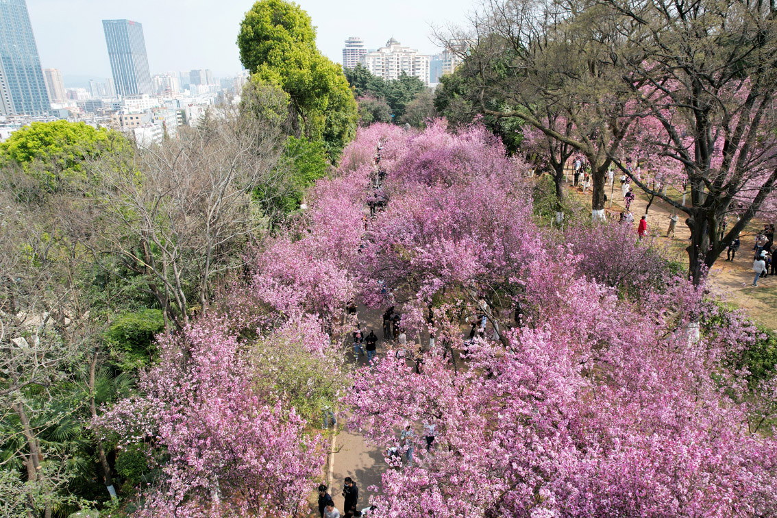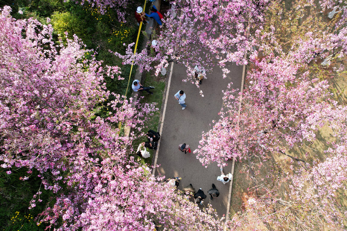 3月7日,云南昆明,游客踏青赏樱花。(无人机照片)图片来源:澳洲网