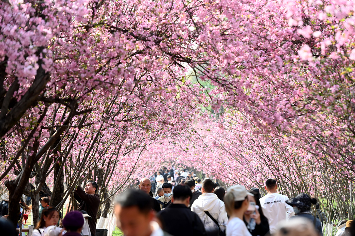 3月7日,云南昆明,绽放的海棠花吸引游客观赏。近日,在位于圆通山的昆明动物园内,云南樱花和垂丝海棠竞相绽放,吸引游客前来观赏“圆通花潮”盛景。(无人机照片)图片来源:澳洲网