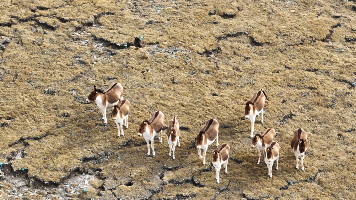 3月15日,航拍成群的藏野驴在祁连山国家公园青海片区天峻县境内山坡上觅食栖息。青海省海西蒙古族藏族自治州天峻县大部地处祁连山国家公园青海片区。近年来,该县开展生态环境综合治理,生态环境持续改善,珍稀野生动物种群数量不断增加。(无人机照片)图片来源:澳洲网