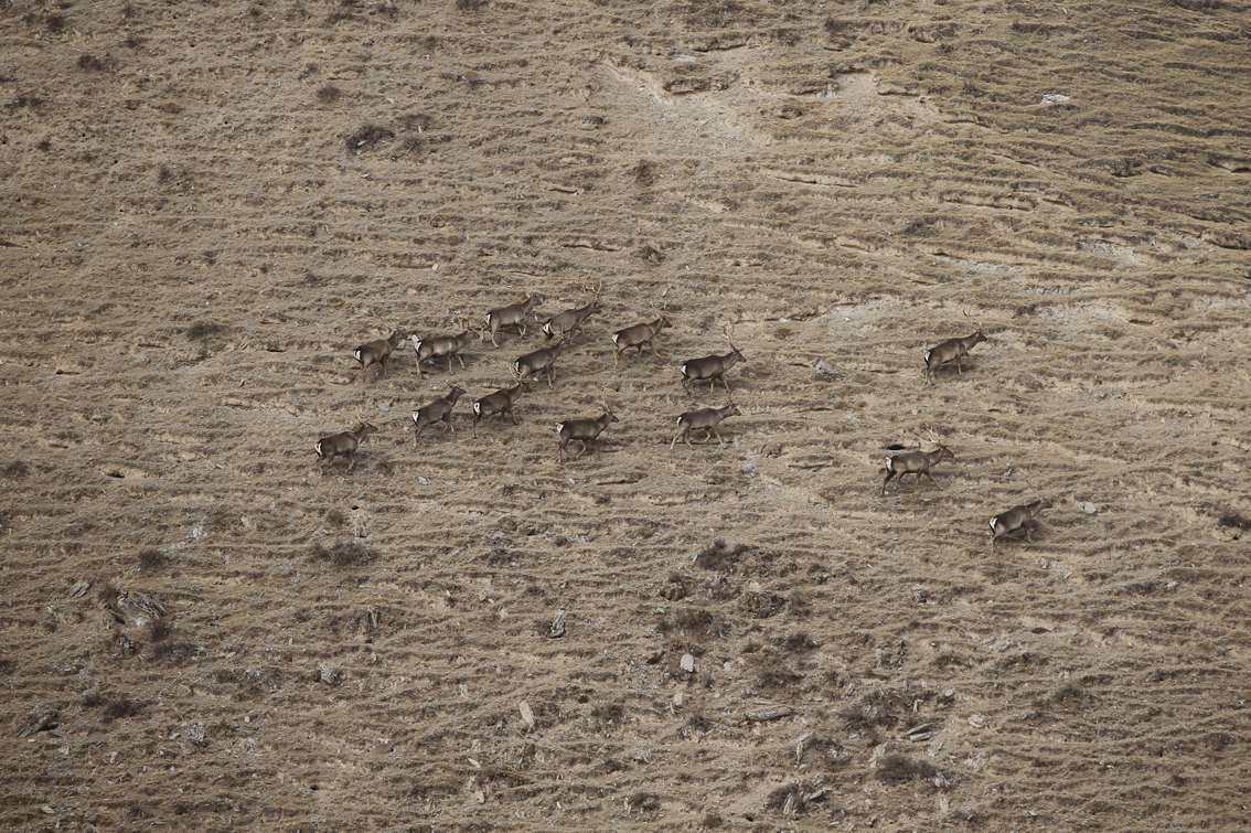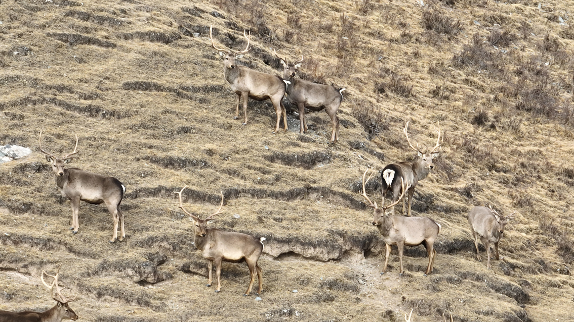 3月15日,航拍成群的马鹿在祁连山国家公园青海片区天峻县境内山坡上觅食栖息。(无人机照片)图片来源:澳洲网