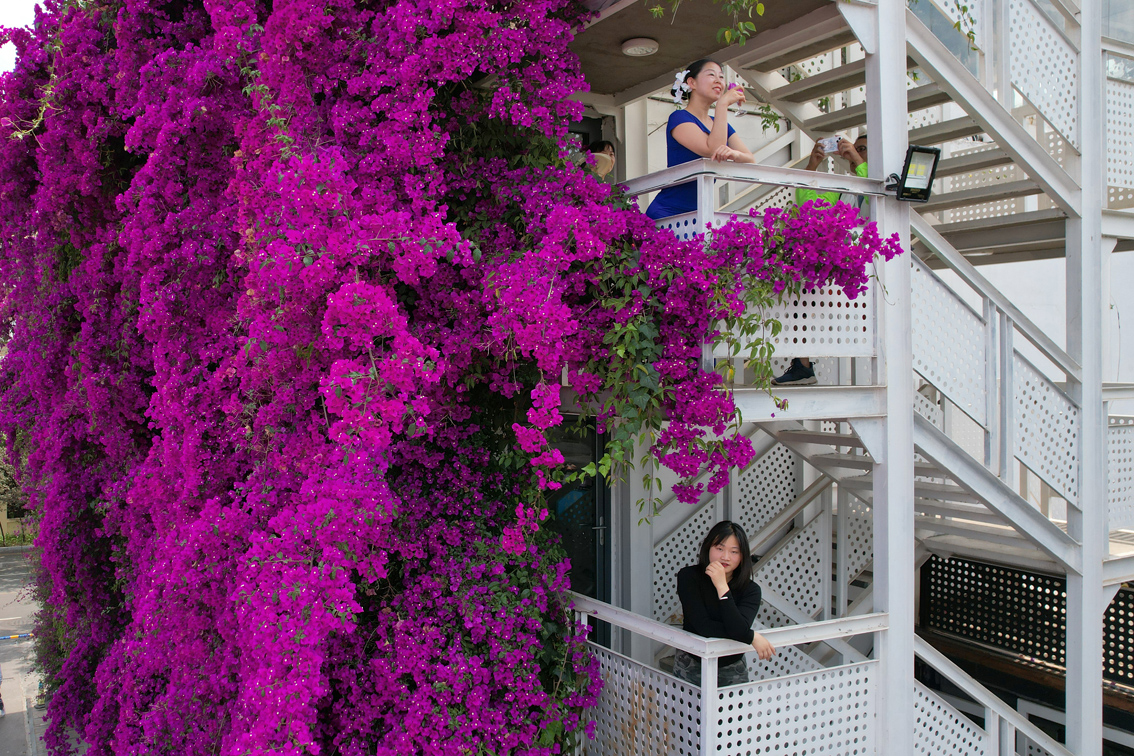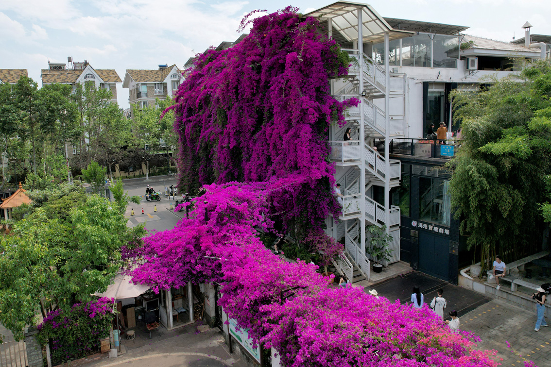 5月9日,三角梅盛放如“鲜花瀑布”。(无人机照片)图片来源:澳洲网