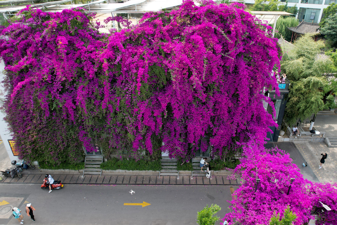 5月9日,市民在花丛中享受惬意时光。近日,云南省昆明市街头的三角梅迎来盛花期,盛开的花朵如瀑布般倾泻而下,吸引许多市民前来观赏、拍照。(无人机照片)图片来源:澳洲网