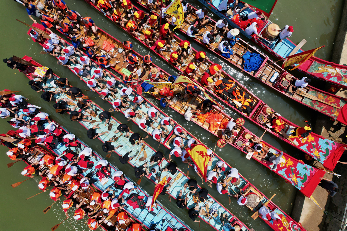 6月13日,俯瞰参与祭江的龙船。当日,福建省仙游县举办木兰溪端午节龙舟传统祭江仪式,吸引当地民众前来观看。(无人机照片)图片来源:澳洲网