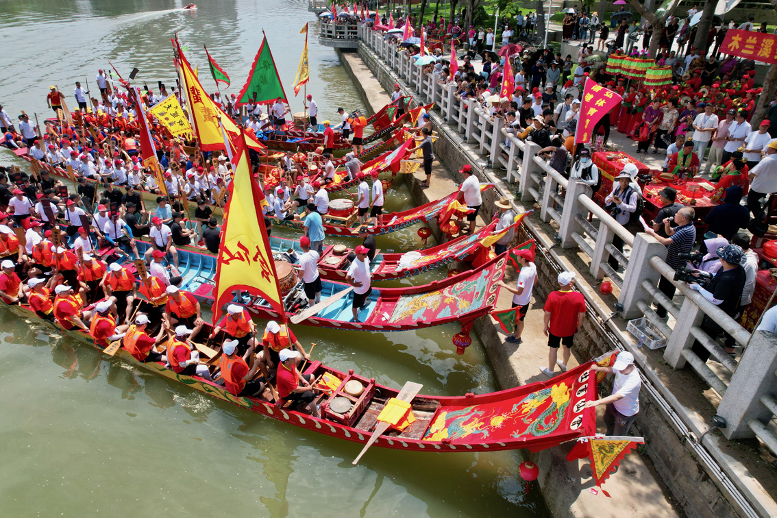 6月13日,福建省仙游县举办木兰溪端午节龙舟传统祭江仪式,吸引当地民众前来观看。(无人机照片)图片来源:澳洲网
