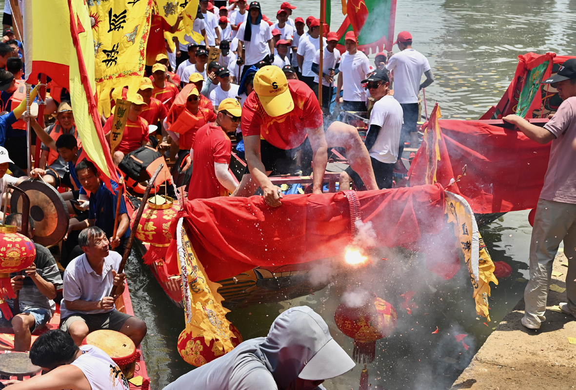 6月13日,龙舟队员放鞭炮。图片来源:澳洲网