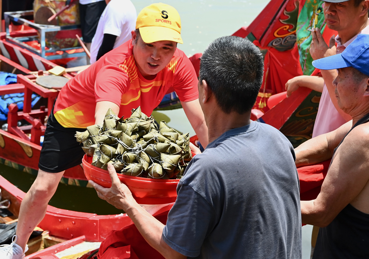 6月13日,工作人员往龙舟上传送粽子。图片来源:澳洲网