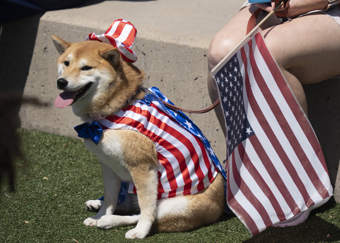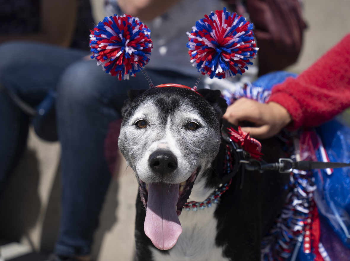 当地时间7月4日,一只宠物犬跟随主人在美国加州旧金山湾区福斯特城参加“独立日”狗狗游行。当日是美国第247个“独立日”,全美各地以举办游行和燃放烟花等方式庆祝这一节日。图片来源:澳洲网