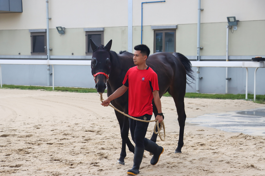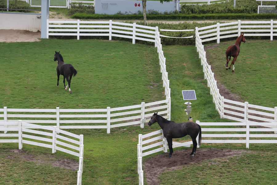 香港赛马会从化马场(简称“从化马场”)位于广州市从化区。从化马场是目前内地最大规模、最高标准、最为完善的纯血马饲养训练中心。在从化马场接受训练的马匹,运回香港可以实时出赛。从化马场运营以来,大批香港赛马陆续运往从化马场驻训,并以每周“两进两出”的运输频次往返粤港两地。图为马场工作人员带领赛马到行马机进行锻炼。图片来源:澳洲网