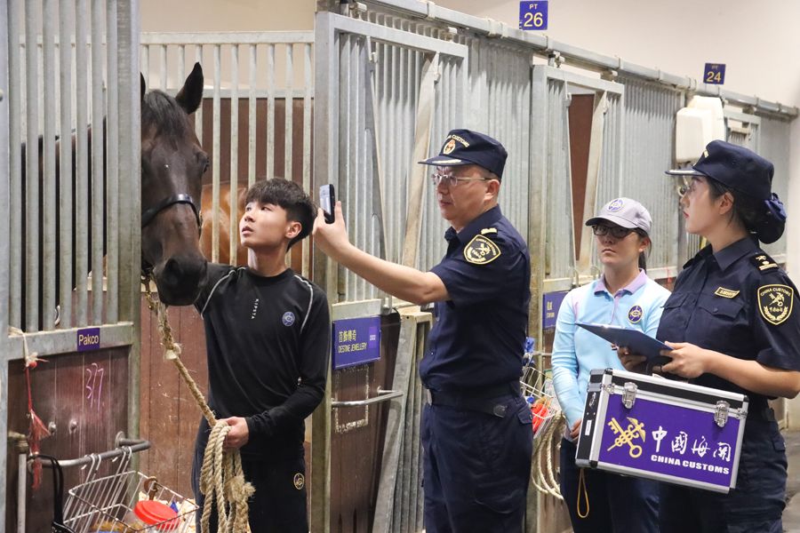 图为广州海关所属从化海关人员对赛马进行临床检查和巡查。图片来源:澳洲网