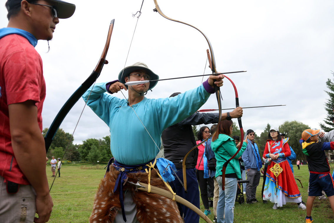 当地时间9月9日,加拿大内蒙古同乡会为联谊乡情,在大多伦多地区纽马克特(Newmarket)举办第五届那达慕大会。这是加拿大内蒙古同乡会在新冠疫情之后首次举办的大型活动。图为那达慕大会的参加者们体验拉弓射箭。图片来源:澳洲网