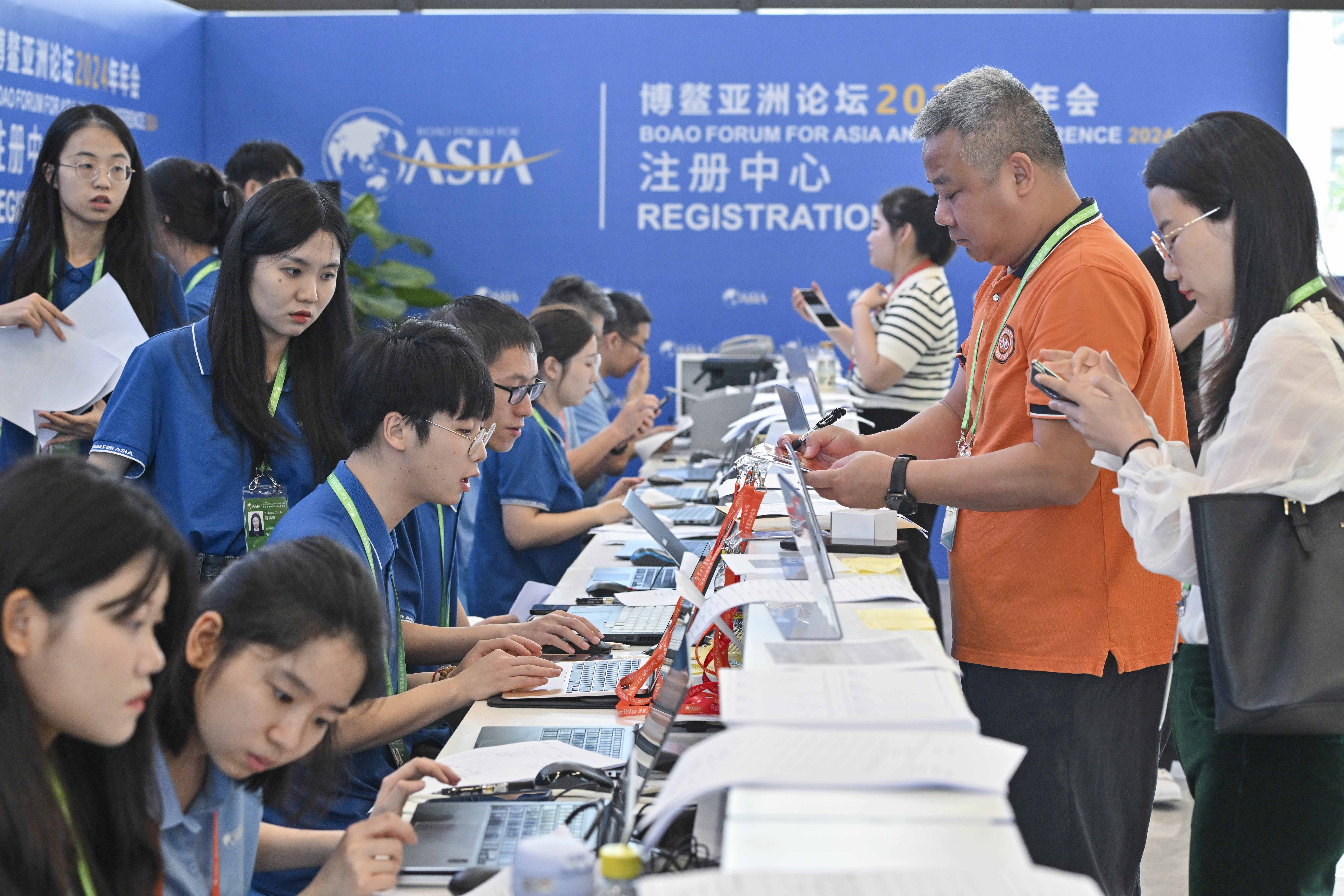 图为3月25日,在博鳌亚洲论坛2024年年会注册中心,工作人员为嘉宾办理注册手续。图片来源:澳洲网