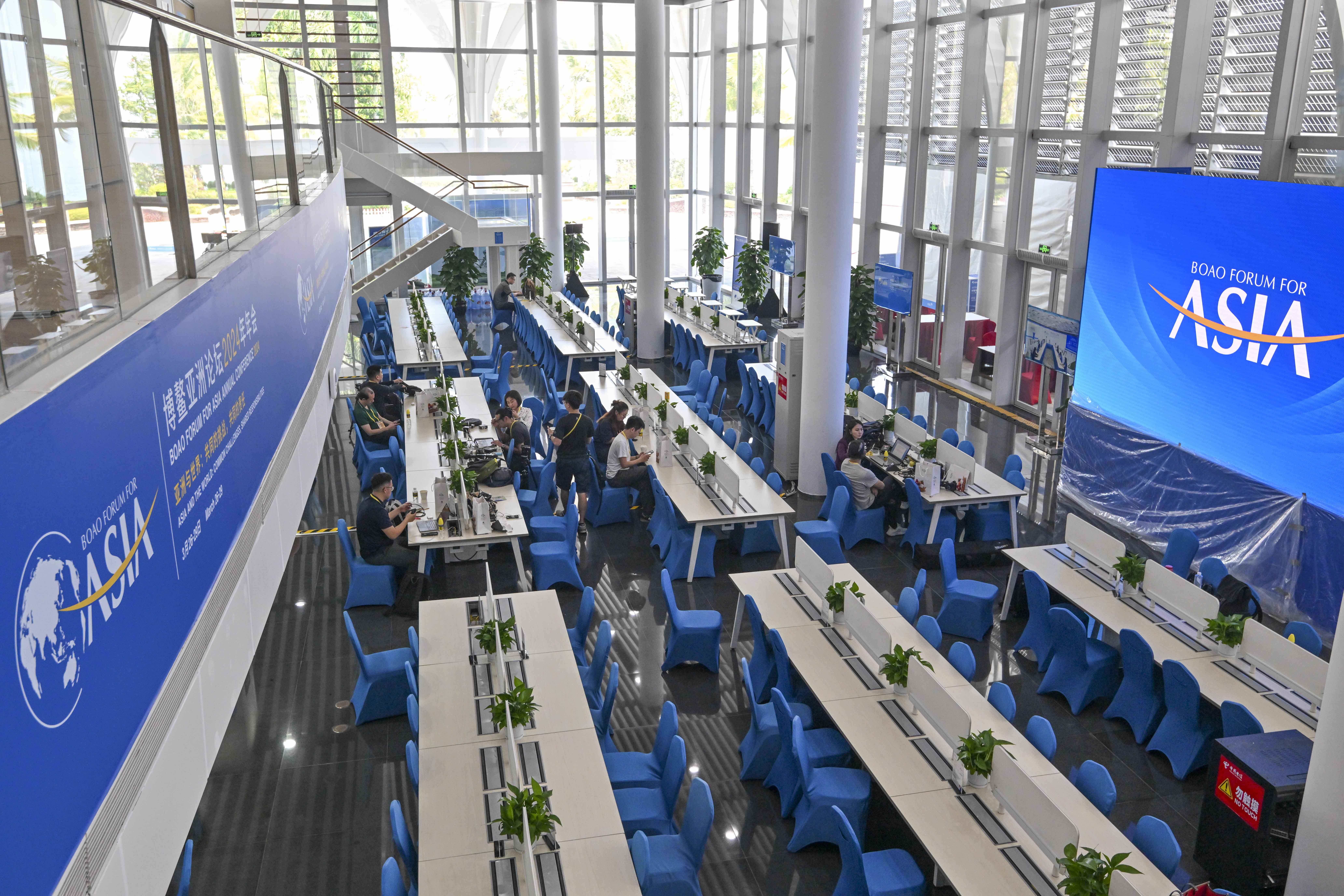 3月25日,博鳌亚洲论坛2024年年会新闻中心正式启用。本届年会接待总规模约5000人左右,其中媒体注册记者近1200人。新闻中心的建筑面积超过4000平方米,有平面媒体及网络媒体工作区、广播电视区、新闻发布厅和独立的采访间等区域。图为媒体记者在博鳌亚洲论坛2024年年会新闻中心工作。图片来源:澳洲网