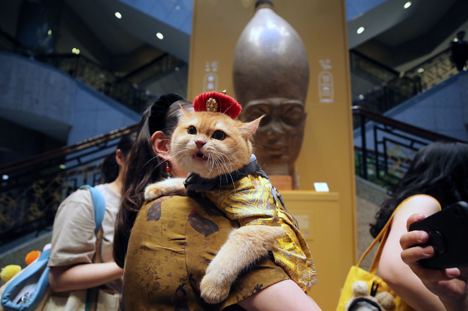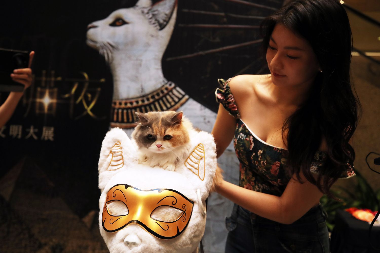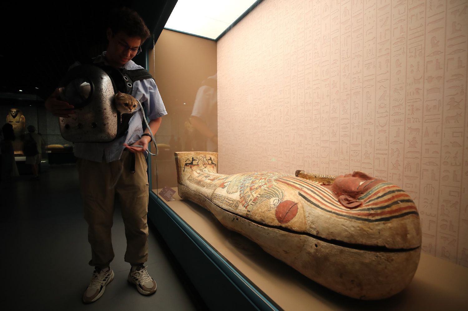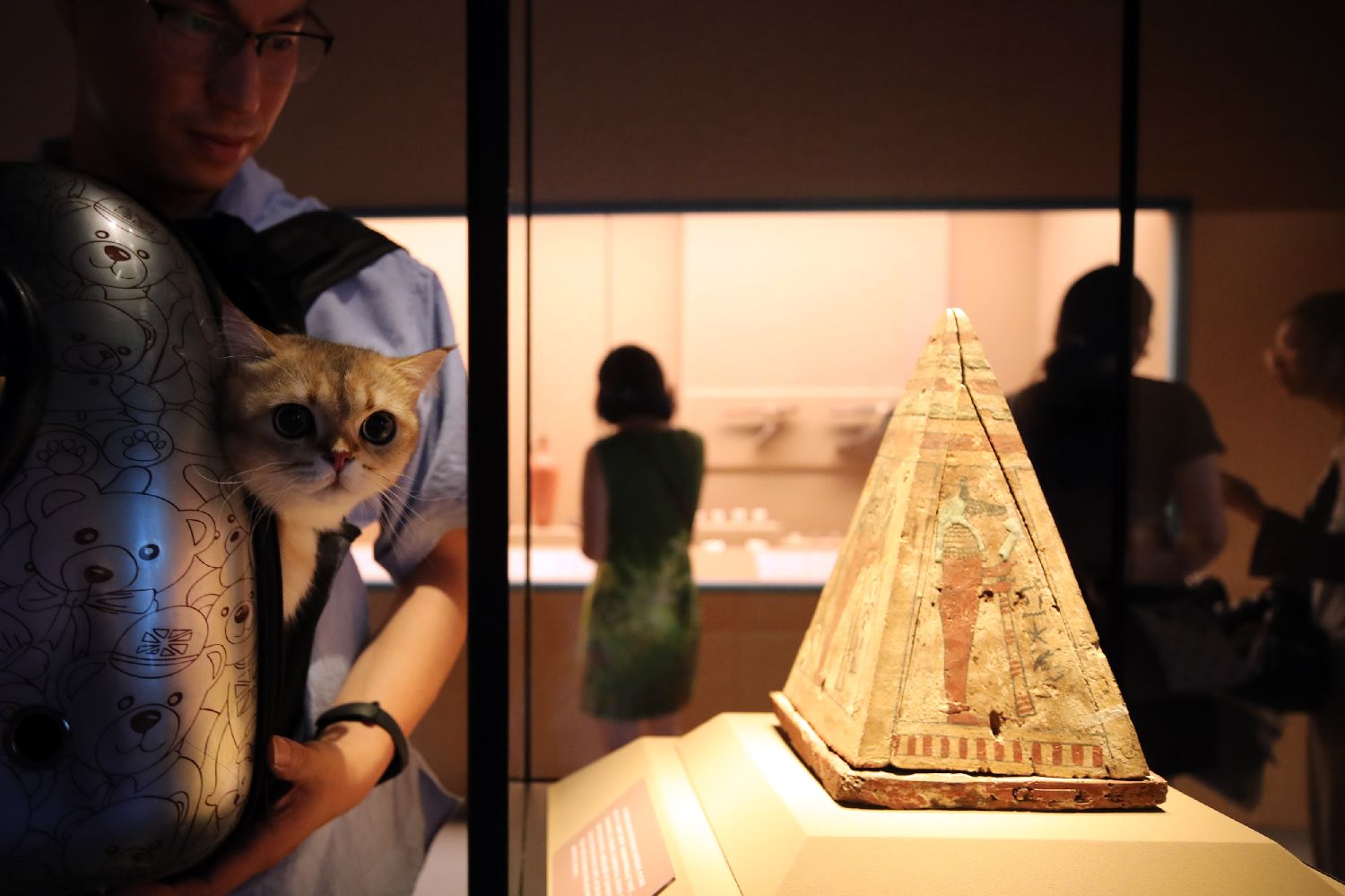 7月27日晚,上海博物馆迎来首场博物馆“奇喵夜”活动。200只精心打扮的宠物猫在主人的带领下齐聚“金字塔之巅:古埃及文明大展”,开启奇妙的观展体验。据了解,带猫看展在全球综合类博物馆中尚属首创。图为观众带领宠物猫一同观展。图片来源:澳洲网