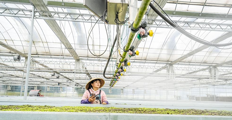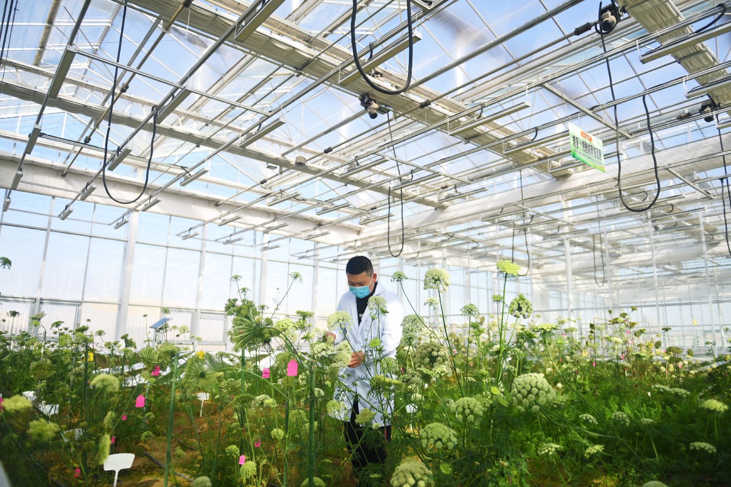 物联网、大数据、云计算等手段有效提高农业生产效率和农产品质量,为乡村振兴注入新活力。甘肃酒泉市近年系统推进蔬菜花卉等种业发展,在戈壁滩育“种”播全球。图为甘肃省酒泉市肃州区酒泉芯农研种业科技有限责任公司人工气候室内,科研人员观察种子生长开花情况。图片来源:中新社