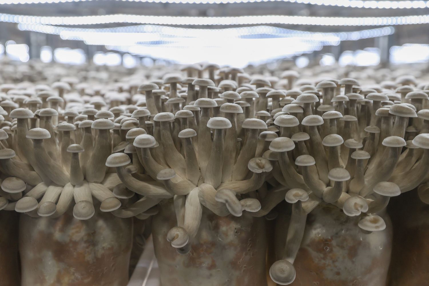 江西安远县的江西天华生物科技有限公司菌菇瓶栽工厂通过运用自动化设备以及物联网、大数据等技术,实现菌菇的智能化、精准化生产,既降低了生产成本,又提高了菌菇品质,年产食用菌达5000万瓶。图为智能出菇房内,一朵朵菌菇生长旺盛。图片来源:中新社