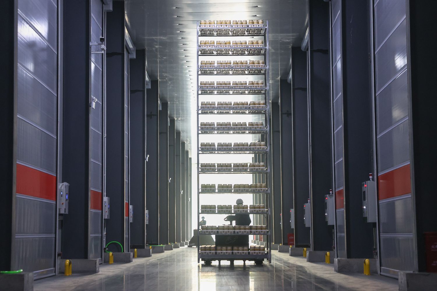 图为工厂的工作人员驾驶拖车将满满一架子菌瓶准备移入智能出菇房。图片来源:中新社