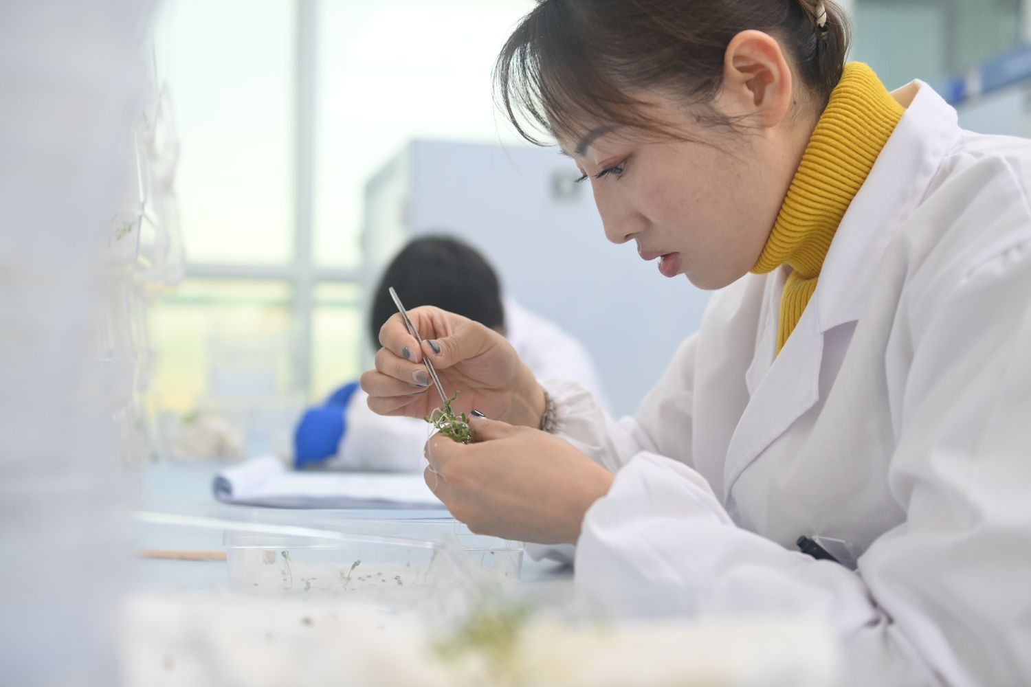 甘肃省酒泉市肃州区国家现代农业(种业)产业园内,酒泉芯农研种业科技有限责任公司科研人员进行种子研发工作。图片来源:中新社