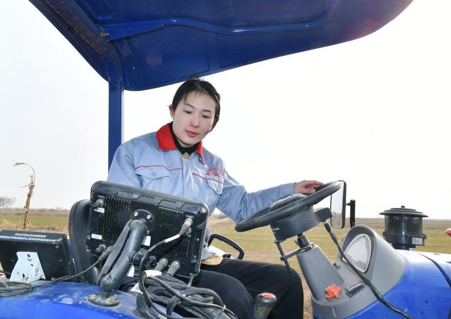 早春的冀中平原,麦苗青青,生机盎然。河北省沧州市沧县鑫翰种植专业合作社负责人张宸早早地来到地里,观察小麦长势,指导社员进行田间管理。图为张宸调试安装了北斗导航辅助驾驶设备的农机。图片来源:新华社