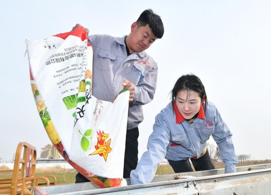 张宸(右)给安装了北斗导航辅助驾驶设备的农机添加肥料。图片来源:新华社