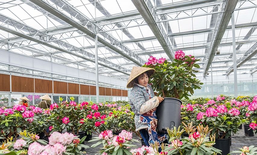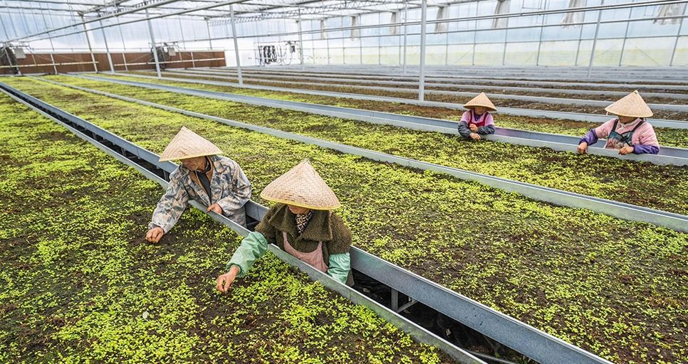 贵州省毕节市七星关区岔河镇大寨社区的村民们正在当地的花卉基地内进行日常的管护工作。图片来源:人民网