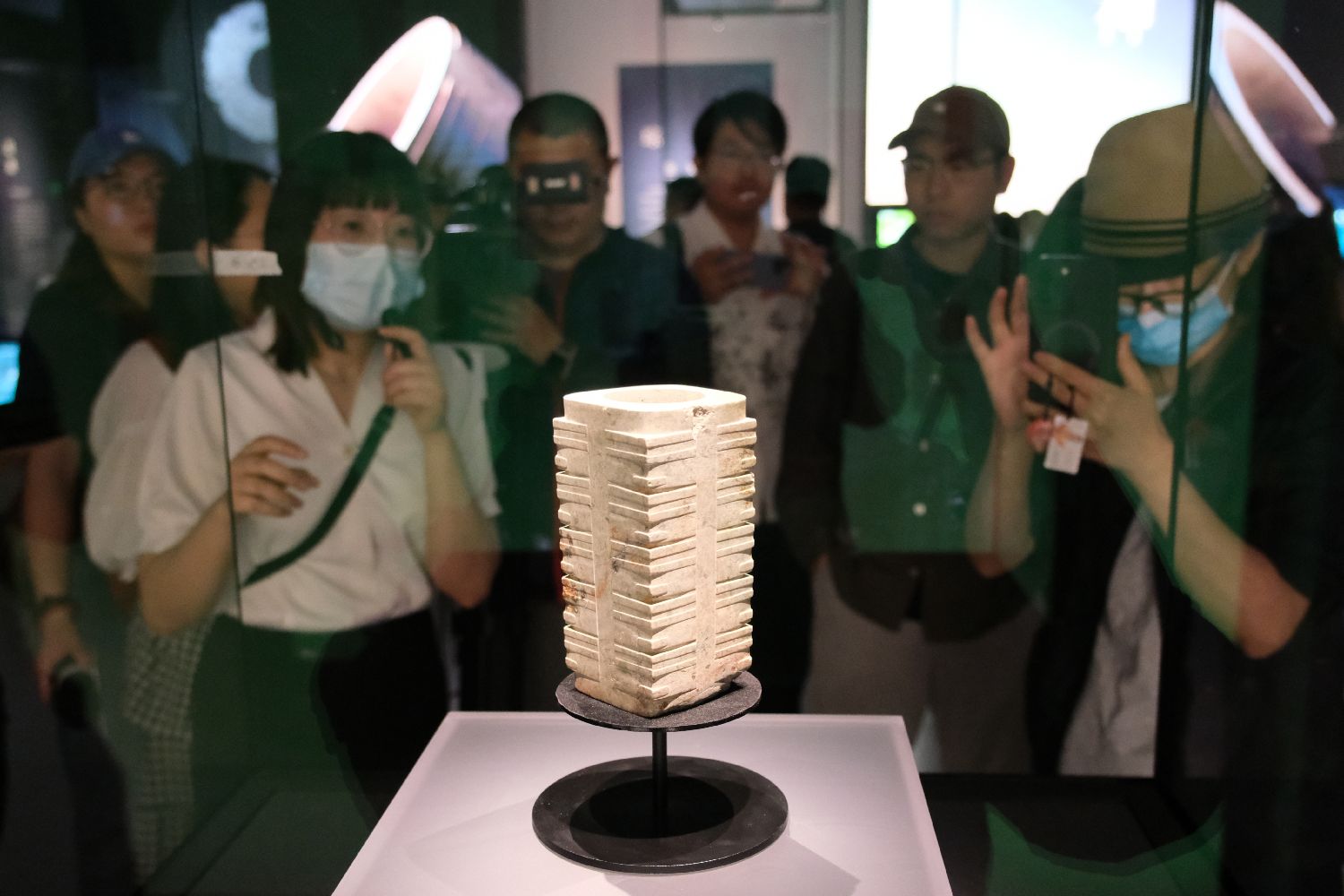 5月12日,探馆观众在良渚文化的高节玉琮前驻足。图片来源:中新社