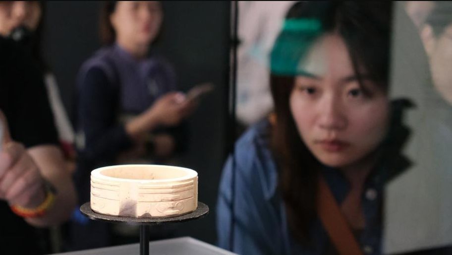 5月12日,浙江杭州,探馆观众在良渚文化的镯式琮前驻足。图片来源:中新网