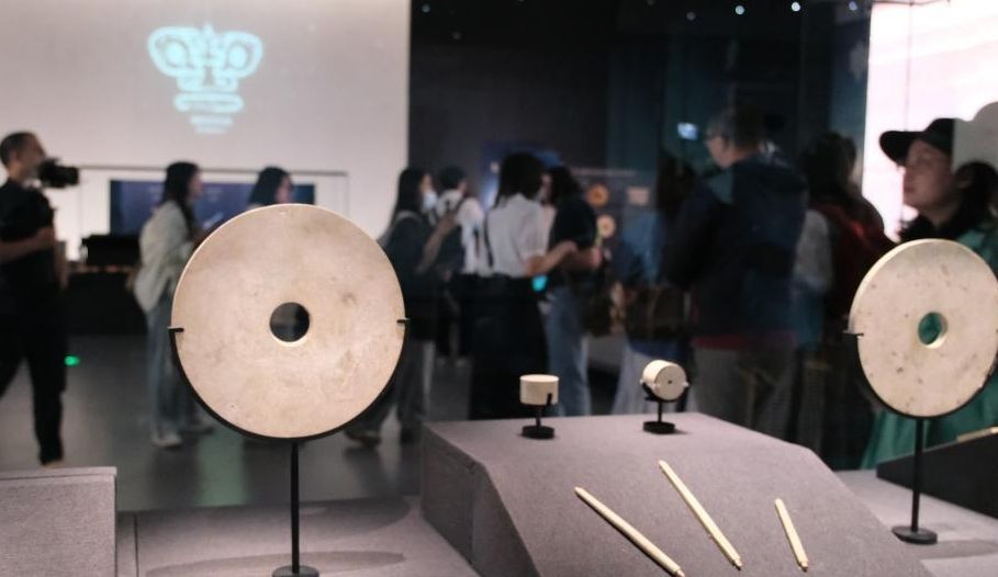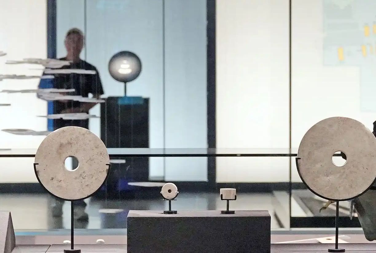 5月12日,浙江杭州,展厅内摆放着良渚文化时期的玉璧。图片来源:中新网