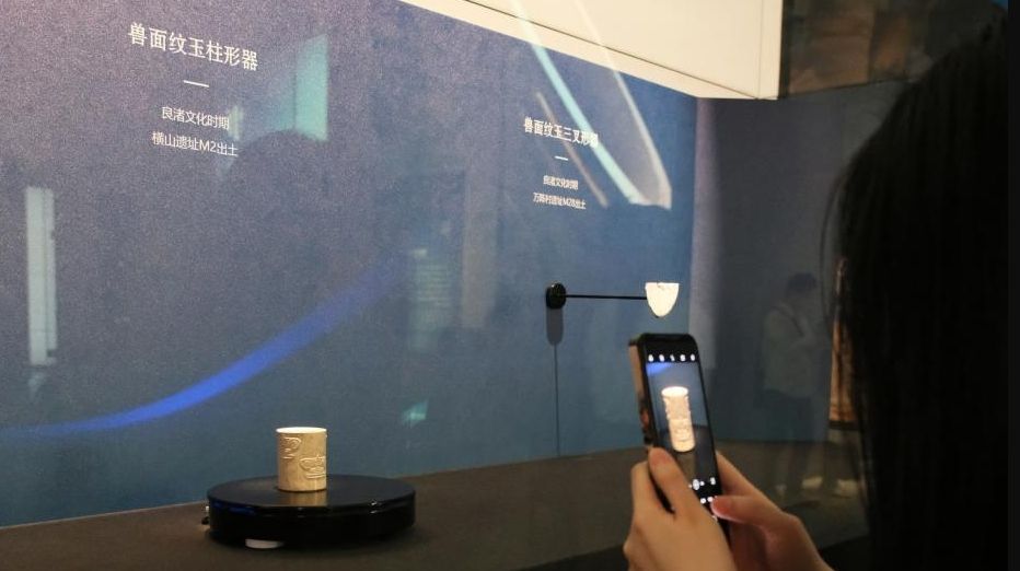 5月12日,浙江杭州,探馆观众在兽面纹玉柱形器前拍照。图片来源:中新网