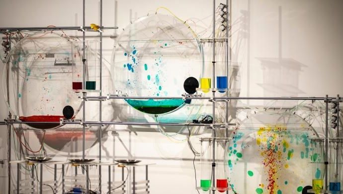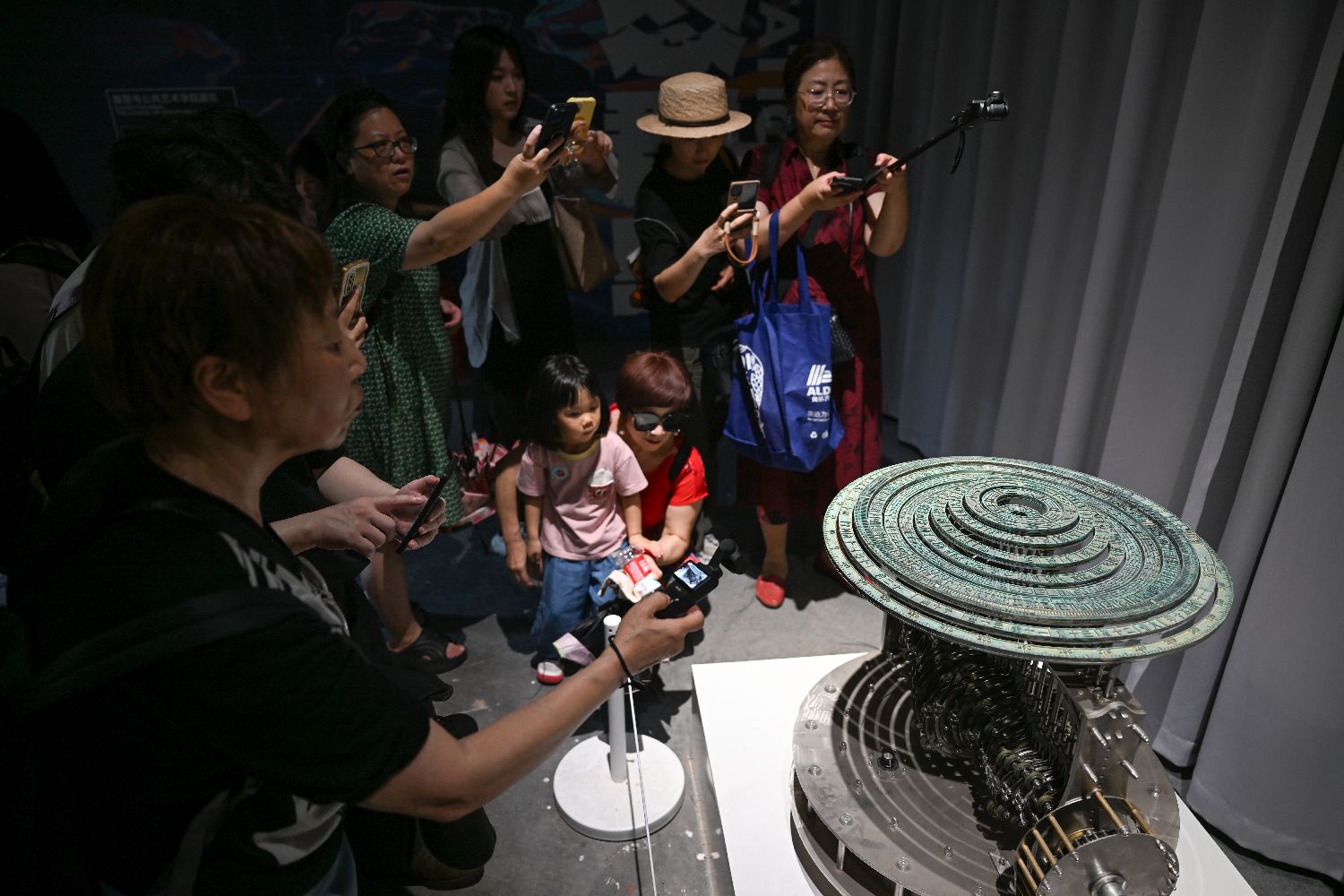 6月18日,毕业作品《滴动仪》吸引观众。作品融入中国篆文和罗盘等元素,通过机械传动方式模拟水滴落水形成涟漪波动。近日,中国美术学院毕业作品展在浙江杭州举行,多件以现代机械表达传统文化的作品展出,其独特创意吸引不少参观者,并在网络走红。图片来源:中新社