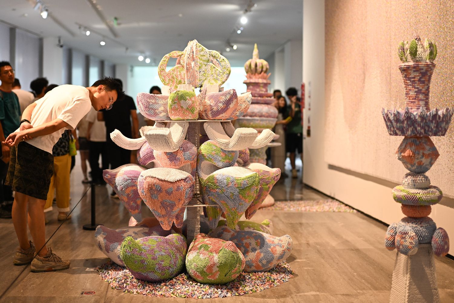 6月12日,四川美院美术馆,一组用便利贴“折”出来的雕塑作品《叠愿》吸引市民。近日,四川美术学院2025年本科生毕业作品展正在该校美术馆举行。图片来源:中新社