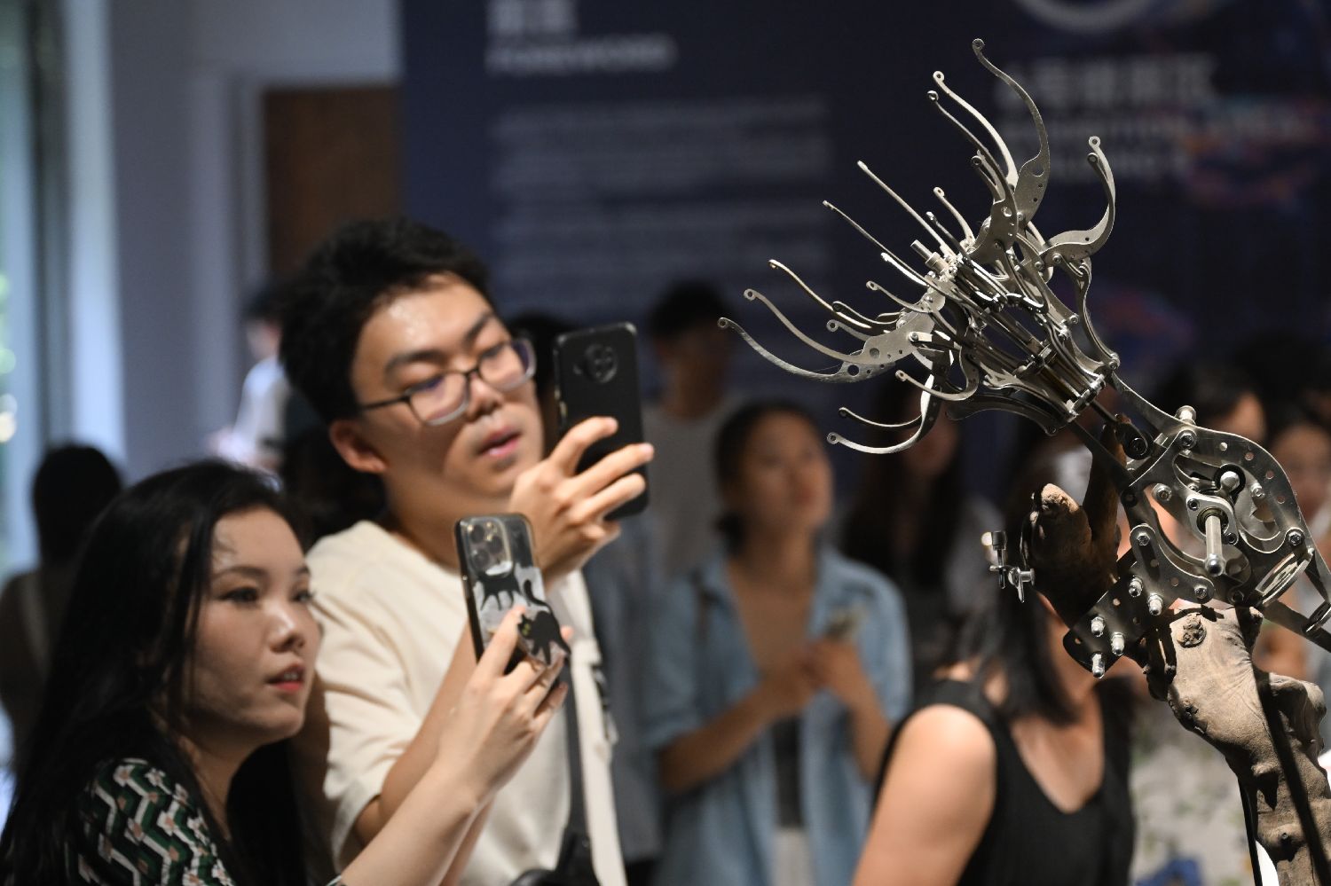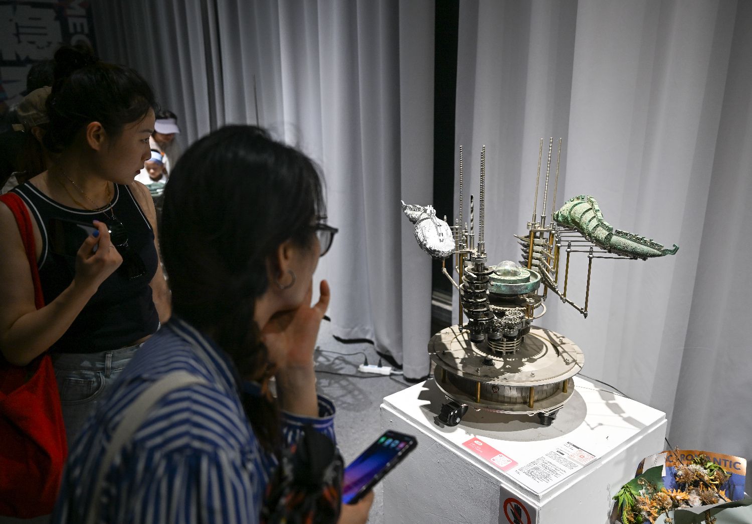 6月18日,金属机械和枯木嫁接的《枯木逢春》吸引参观者。图片来源:中新社