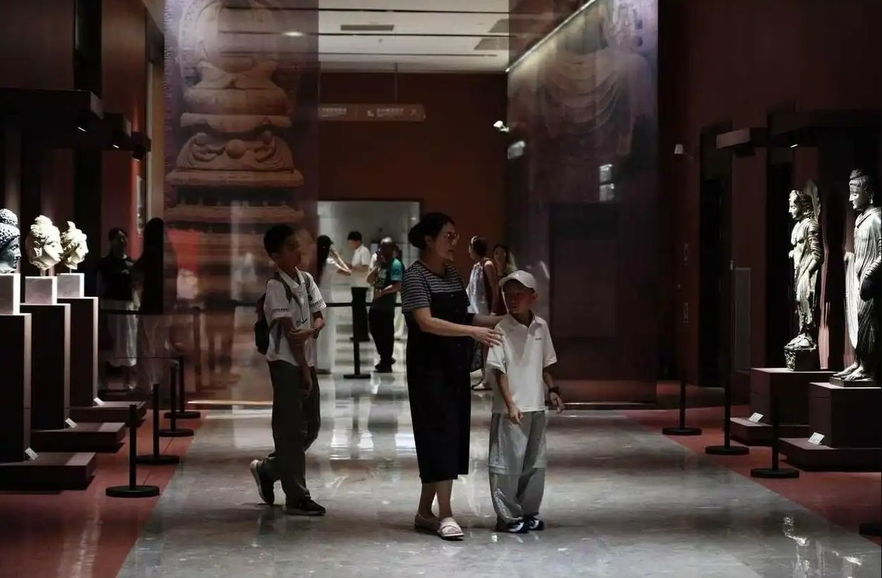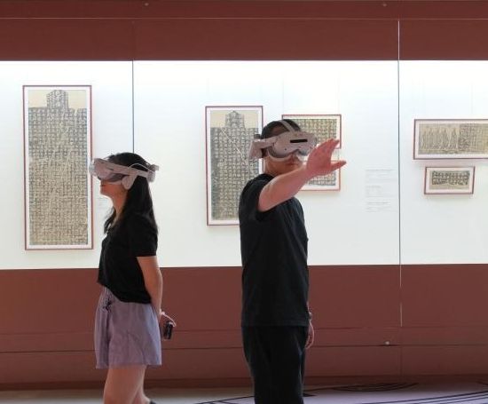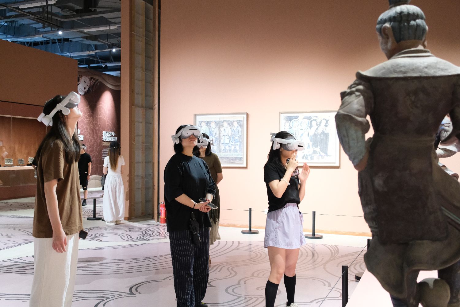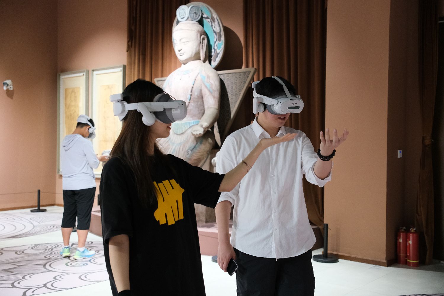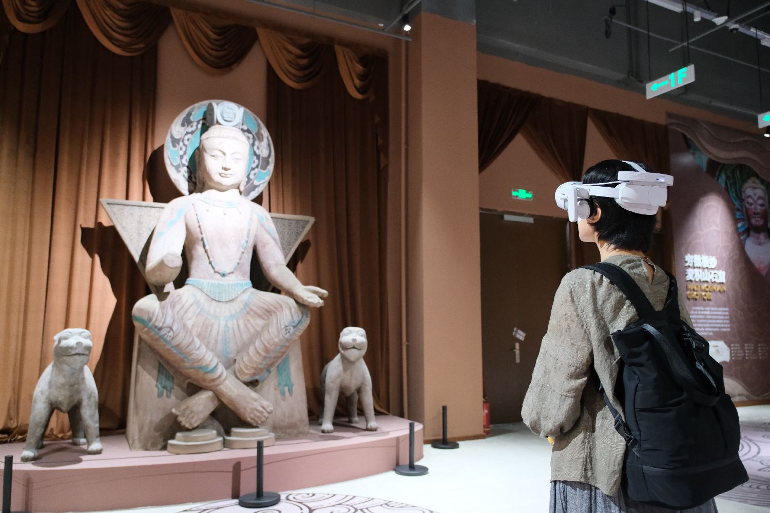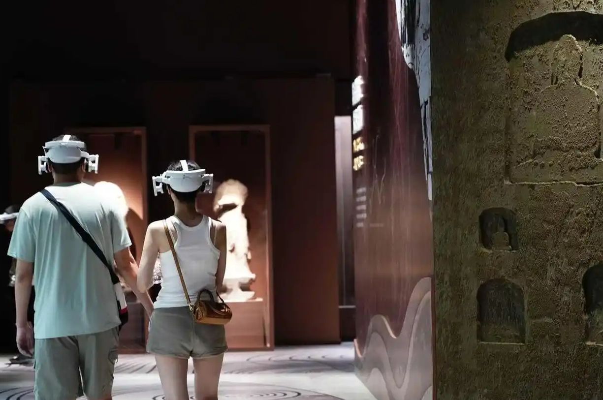 7月8日,一场跨越时空界限的艺术盛宴“相无古今——石窟艺术超感沉浸体验”在浙江省博物馆之江馆区开幕。本次展览由物质现实区域、增强现实区域、虚拟现实区域组成,突破传统文物展示框架,运用前沿数字技术打造超感沉浸空间,引领观众步入一场融合千年石窟艺术精华的感官之旅。图为参观者在展品前互动体验。图片来源:中新社