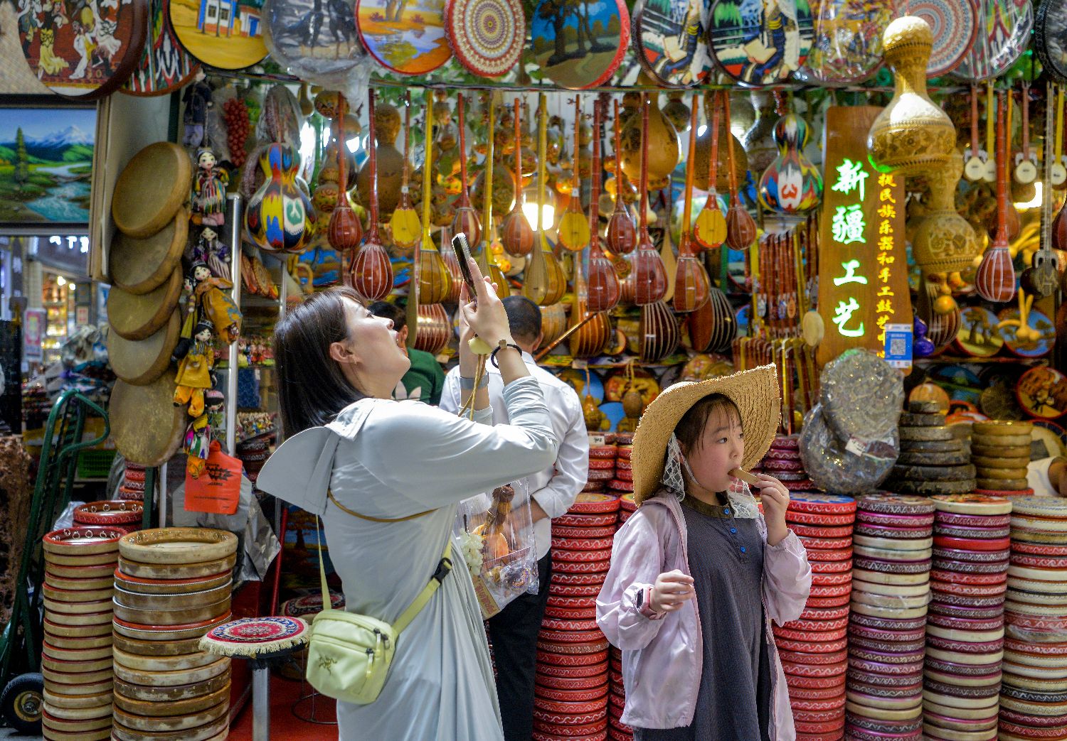 7月17日,在新疆乌鲁木齐市大巴扎步行街,游客被琳琅满目的商品所吸引。乌鲁木齐市大巴扎景区近日迎来旅游高峰,各地游客在此欣赏新疆歌舞、品尝新疆美食、感受新疆风土人情。图片来源:中新社