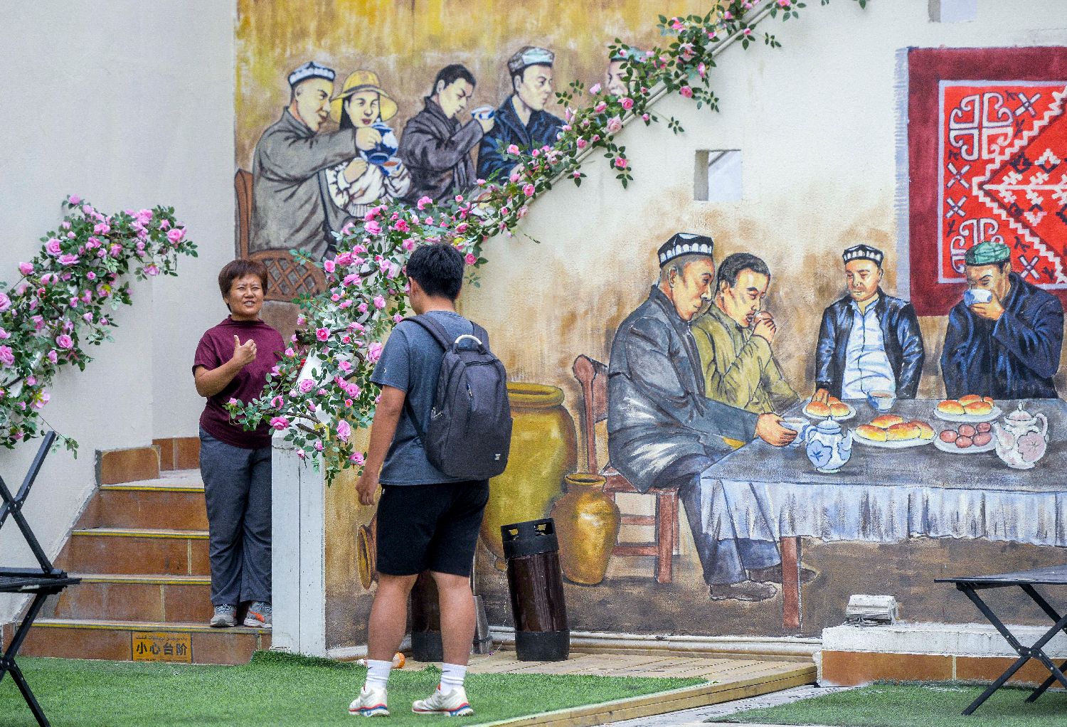 7月17日,在新疆乌鲁木齐市大巴扎步行街,游客在描绘新疆老茶馆的彩绘墙前留影。图片来源:中新社