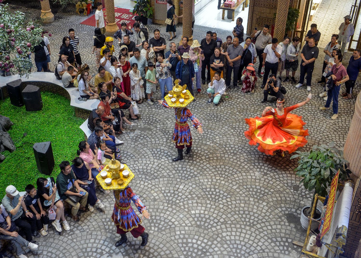 7月17日,在新疆乌鲁木齐市大巴扎步行街,一场极具地方特色的顶碗舞表演,吸引众多游客围观。图片来源:中新社