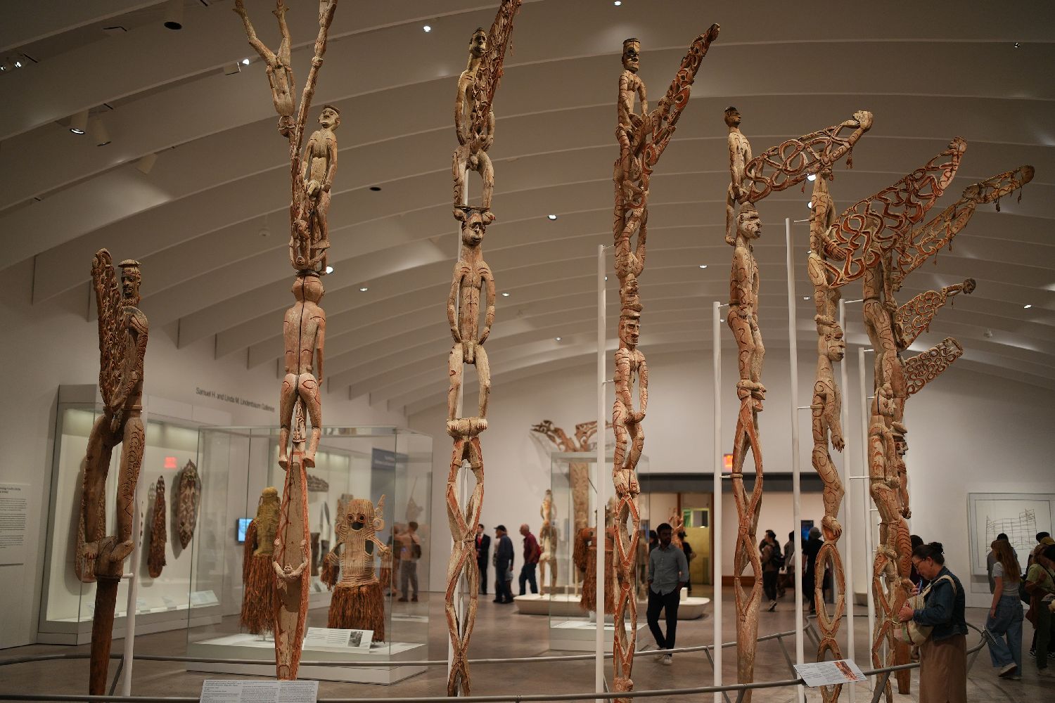 当地时间10月4日,美国纽约大都会艺术博物馆洛克菲勒翼楼展出的新几内亚岛阿斯马特人“祖先柱”木雕吸引观众参观。洛克菲勒翼楼自2021年起关闭,历时四年进行翻修。这座收藏非洲艺术、古代美洲艺术和大洋洲艺术的场馆于今年年中重新开放后,受到观众持续关注。图片来源:中新社