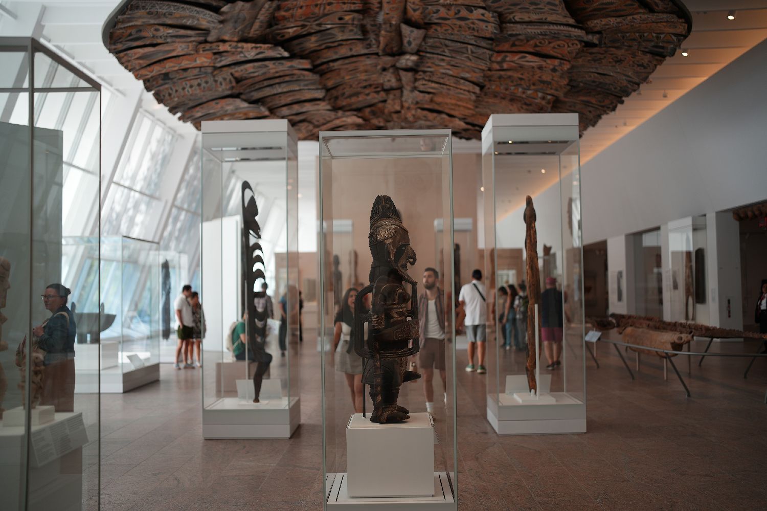 当地时间10月4日,美国纽约大都会艺术博物馆洛克菲勒翼楼展出的巴布亚新几内亚新爱尔兰木雕吸引观众参观。图片来源:中新社