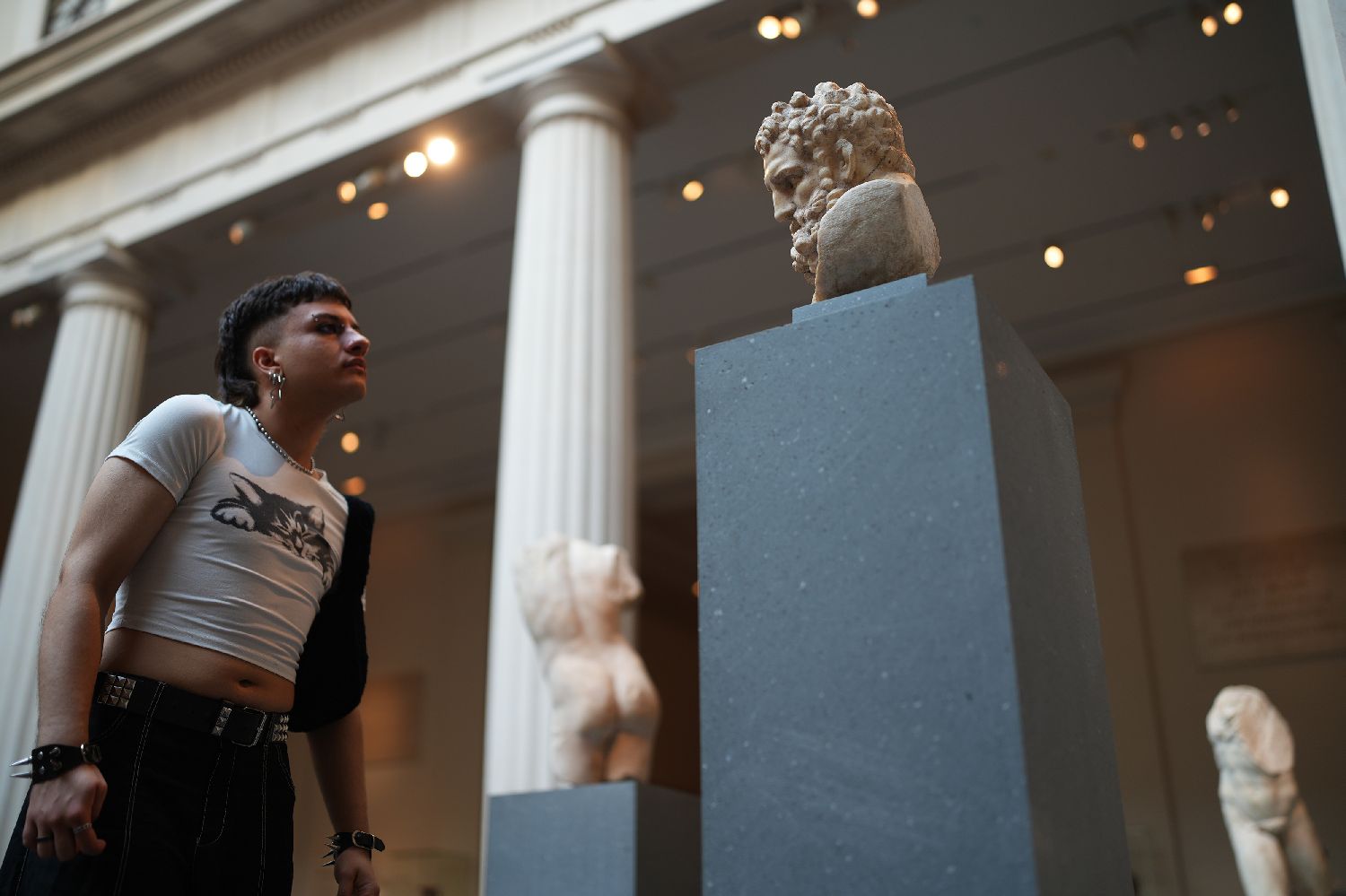 当地时间10月4日,美国纽约大都会艺术博物馆希腊和罗马艺术展区,一名打扮前卫的青年观众凝视赫拉克勒斯大理石头像,赫拉克勒斯是希腊神话中的英雄。大都会艺术博物馆2025财年接待游客超过570万人次,其中本地观众参观人数同比增长5%。图片来源:中新社