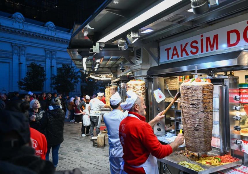 11月19日,厨师在伊斯坦布尔独立大街上的餐馆制作土耳其旋转烤肉。独立大街位于土耳其最大城市伊斯坦布尔欧洲一侧,街道两边商铺林立,是伊斯坦布尔最繁华的步行街。图片来源:新华网