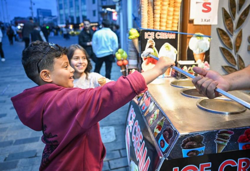 11月19日,两名儿童在伊斯坦布尔独立大街上体验土耳其冰激凌戏法。图片来源:新华网