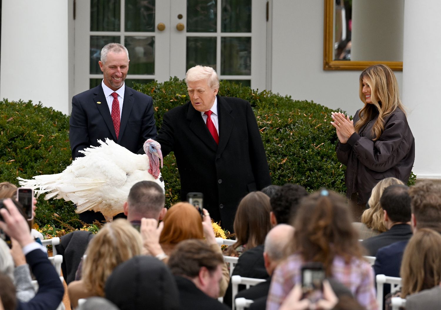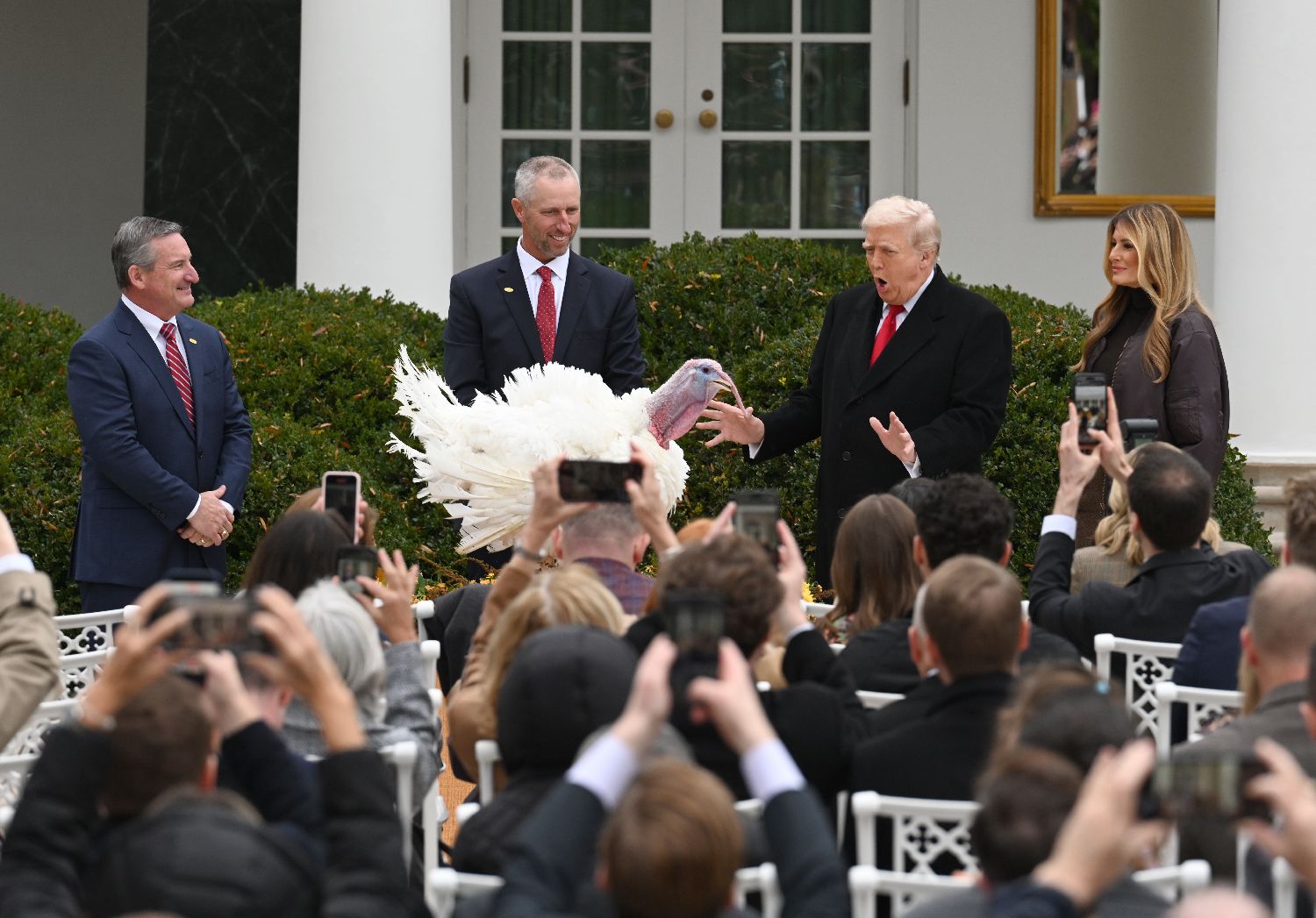 当地时间11月25日,华盛顿,美国总统特朗普在白宫“赦免”2025年感恩节幸运火鸡“咯咯”(Gobble)和“晃晃”(Waddle)。经过网络票选,“咯咯”获得了上台接受总统“赦免”的机会。图片来源:中新社