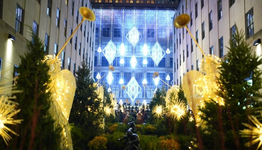 当地时间11月30日,纽约洛克菲勒中心点亮节日灯光秀。图片来源:中新网