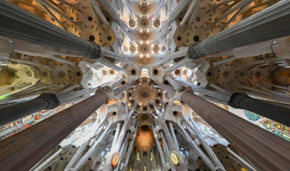 这是12月1日在西班牙巴塞罗那拍摄的施工中的圣家堂中央塔楼中殿顶部。图片来源:新华网