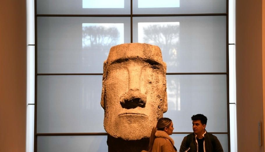 图为来自太平洋岛屿复活节岛的一尊摩艾石像在“五洲艺廊”展出。图片来源:中新网