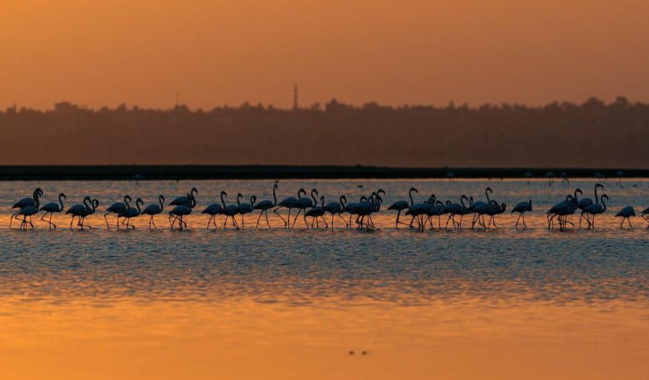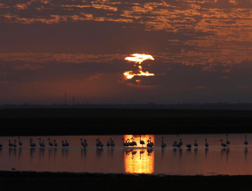 这是12月6日日出时分在埃及法尤姆省加龙湖拍摄的火烈鸟。图片来源:新华网