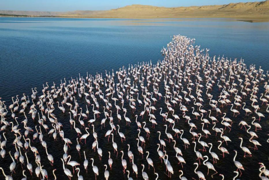 这是12月6日在埃及法尤姆省加龙湖拍摄的火烈鸟(无人机照片)。图片来源:新华网