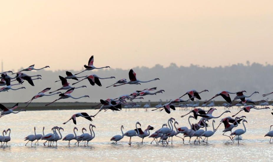 这是12月6日在埃及法尤姆省加龙湖拍摄的火烈鸟。图片来源:新华网