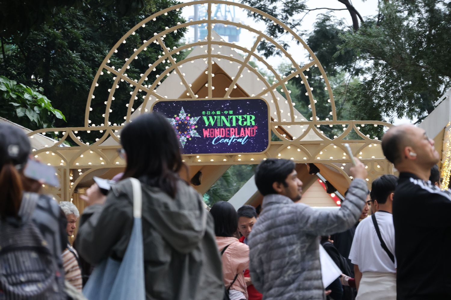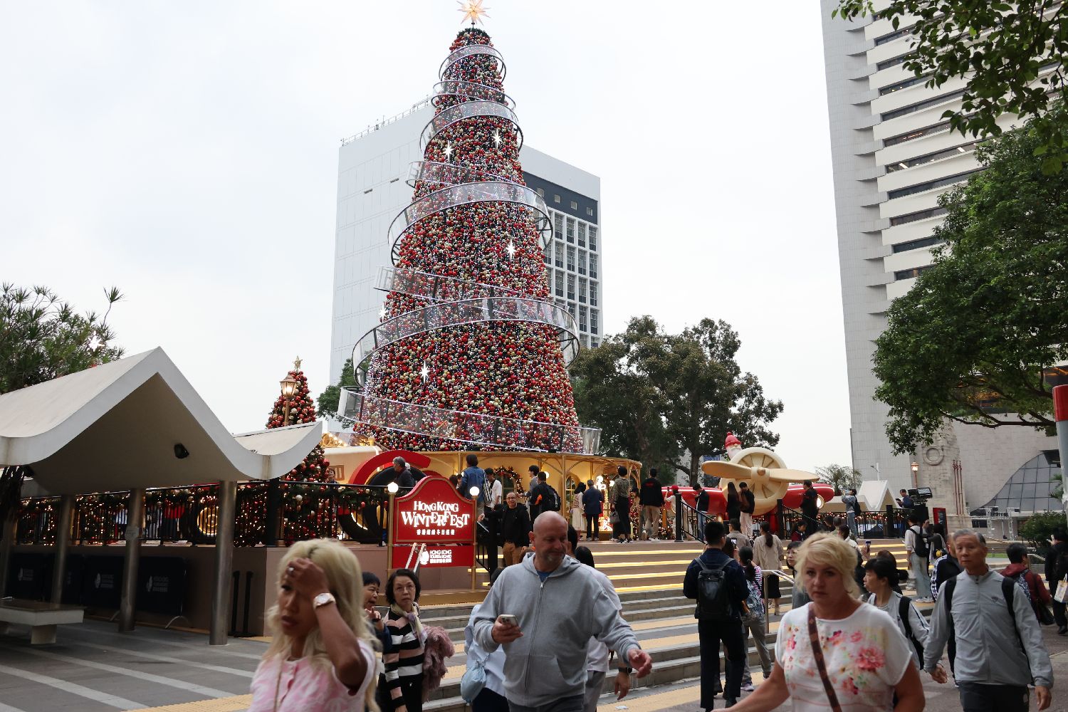 12月10日,香港旅发局设于中环皇后像广场的“冬日小镇·中环”重开。遮打道“星光长廊”及“光影汇·中环”灯光汇演同时开始推出。有关汇演原定11月28日举行启动礼,旅发局因应宏福苑火灾,押后启动礼。“光影汇·中环”会透过8幢中环地标外墙,以及皇后像广场内的全息投影地面装置,以投影、LED动画及灯光特效呈现。图片来源:香港中通社